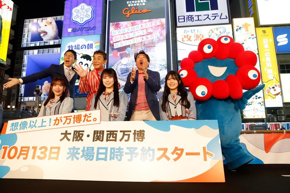 とんぼりリバーウォーク(大阪市中央区)で10月13日、「大阪・関西万博 開幕半年前イベントin道頓堀」が開かれ、ダチョウ倶楽部、NMB48が登場した。