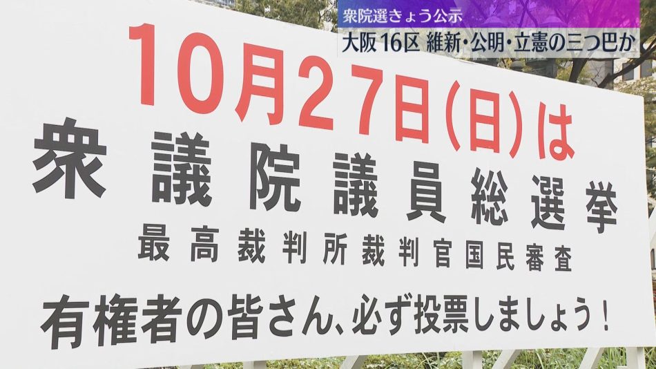 衆議院選挙が15日公示され、関西でも12日間にわたる選挙戦がスタートしました。 大阪16区では、これまでに3人が立候補の届け出を済ませ、さっそく有権者に支持を訴えました。日本維新の会は、今回初めて、公明党が議席を獲得してきた大阪と兵庫の6つの選挙区に候補者を擁立していて、大阪16区は、立憲民主党の候補者も含めた“三つ巴の選挙戦”となる見通しです。 日本維新の会・黒田征樹候補(44) 「われわれ維新の会は、組織や業界団体から支援を一切受けていませんし、これからも受けるつもりはありません。しがらみのない政治で国民の皆様が本当に必要とする政治を実現していく」 公明党・山本香苗候補(53) 「今回の選挙に背水の陣で臨んでまいります。きめの細かい経済対策を自公の安定した政治のもとで、ぜひとも実現させていただきたい」 立憲民主党・森山浩行候補(53) 「政権交代で政治の大掃除をする。この部分に加えて、もう1つは今の政治の在り方を変えていくということ。 一回決めたことを変えられない、そんな古い維新・公明の政治を変えていきましょう」 選挙管理委員会によりますと、近畿2府4県の45小選挙区にはこれまでに194人が立候補し、府県別では、大阪で76人、兵庫で56人、京都で29人、滋賀で10人、奈良で13人、和歌山で10人となっています。(15日午前11時現在) 立候補の受け付けは、15日午後5時で締め切られ、投開票は10月27日に行われます。