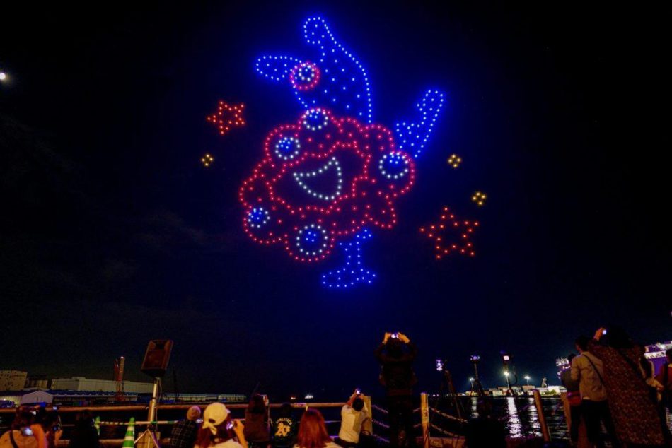 公式キャラクター「ミャクミャク」が、会場の人工島・夢洲(ゆめしま)近くの夜空に現れた。