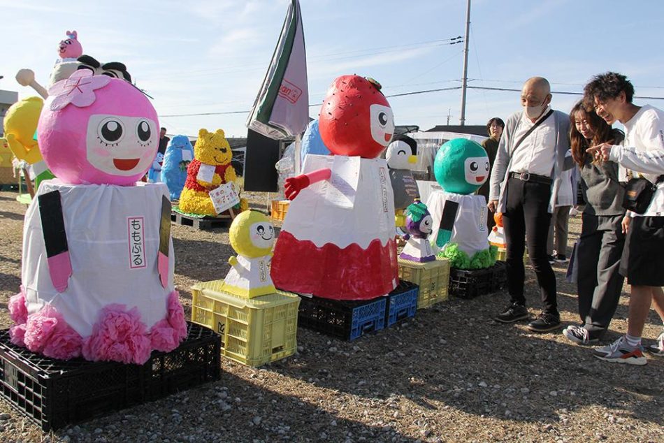 紀の川市の「紀の川ぷるぷる娘」のかかしも和歌山市の小倉地区の秋を彩る「かかしコンテスト」が19、20日に行われ、ユニークな手作りかかしが並んだ。かかしを通じて地域を盛り上げ、交流を深めようと同市新庄の社会福祉法人哲人会・小倉園のメンバーでつくる実行委員会が主催し、10回目。県内の80事業所・団体から204体の応募があり、一般投票も受け付けた。会場には、海南市のPRキャラ「海ニャン」、大阪・関西万博の「ミャクミャク」、米・大リーグで活躍する大谷翔平選手