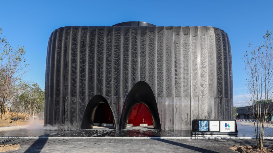 水しぶきを上げて流れ落ちる滝が建物を覆うパビリオンが大阪・関西万博にお目見えする。石黒浩氏がテーマ事業プロデューサーを務めるパビリオンは外観が真っ黒で表面を水が流れる。
