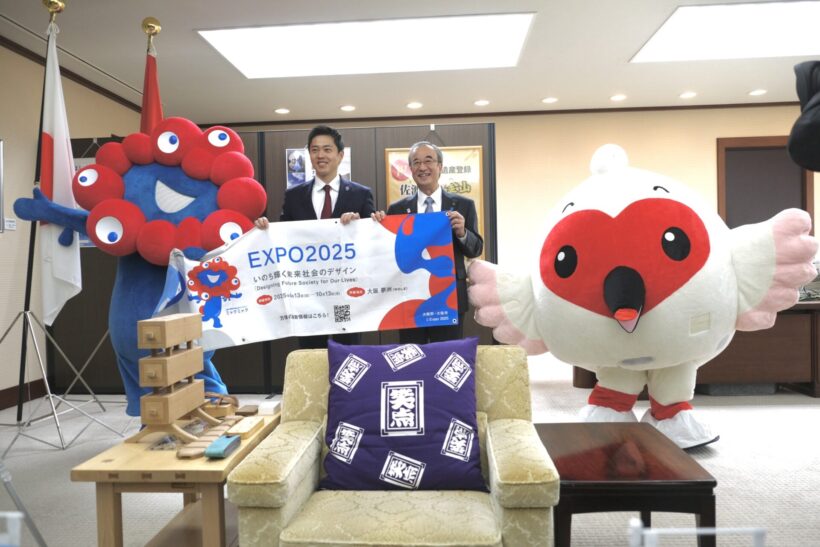 大阪府の吉村洋文知事が11月8日、新潟県の花角英世知事を訪問し、2025年春に開幕する「大阪・関西万博」への協力を求めた。訪問には同万博の公式キャラクター「ミャクミャク」も同行、新潟県の「トッキッキ」