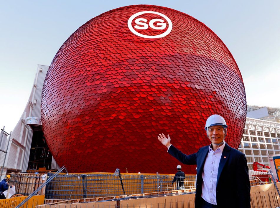 EXPO 2025 大阪・関西万博 シンガポールパビリオンのプレスリリース(2024年11月27日 11時00分)シンガポールパビリオン、ドリーム・スフィア(赤い球体)の外観が完成、約1万7千枚以上のディスクが施されたサステナブルでユニークなデザイン