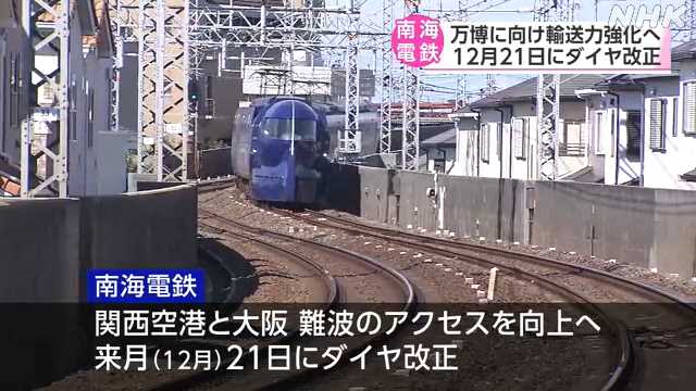 【NHK】来年の大阪・関西万博に向けて、外国人旅行客の増加が見込まれることから、南海電鉄は、来月21日に(12月)ダイヤ改正を行い、関西空港と大阪・…