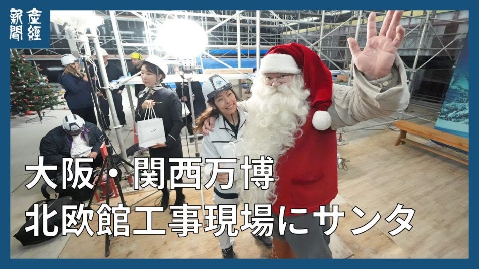 建設工事が進む大阪・関西万博の北欧館にサンタクロースが訪れ、工事関係者らにプレゼントを手渡した。